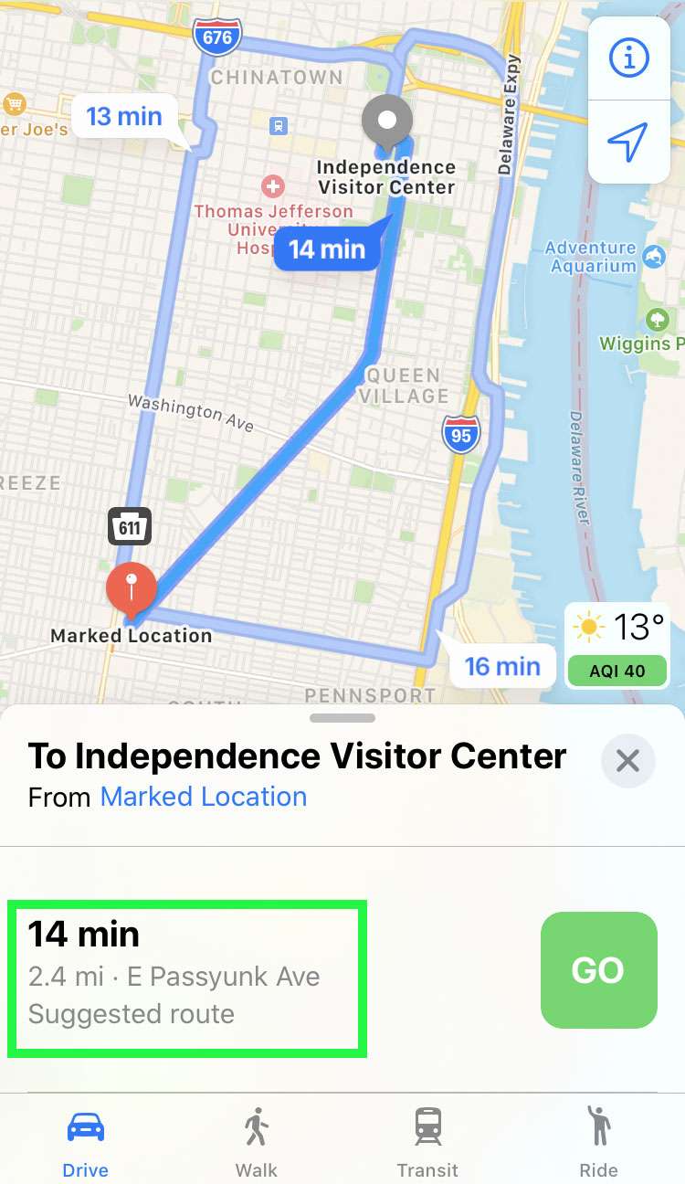 By default, Apple Maps gets directions from your current location, and delivers the distance to your destination. Measuring the distance between two places which are different than the current location takes a few more steps. By marking a location, then getting the route between points, Apple Maps can measure the route distance on the iPhone, iPad, or iPod touch. Travel time based on the mode of transportation chosen, as well as the distance in miles or kilometers is displayed.