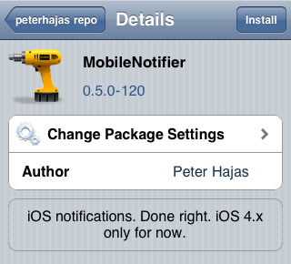 The peterhajas repo containing the MobileNotifier package is located at http://phajas.xen.prgmr.com/repo/. Once the repo is added navigate to Manage -> Sources -> phajas.xen.prgmr.com -> MobileNotifier. Touch the Install button then tap Confirm. Once the tweak is installed you will notice a new section under Settings labeled MobileNotifier.