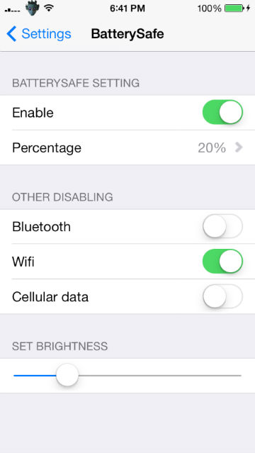situation can be avoided, or at least pushed back a bit, with the new jailbreak tweak BatterySafe. You can download BatterySafe for free from Cydia's BigBoss repository. Once installed, go to Settings -> BatterySafe to configure the settings. Here you can set a battery percentage (10%, 20% ...) that, once reached, will set BatterySafe into action. You can have it turn off Bluetooth, Wi-Fi and cellular data individually or all, if you want. BatterySafe will also dim the device's screen when the danger level is reached, and you can set the brightness that it will dim to.