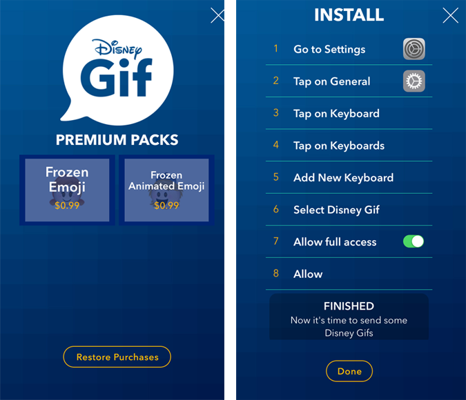 Like any third-party keyboard, installing is the trickiest part. This process requires a few extra steps after getting the app from the App Store. After download, navigate to Settings -> General -> Keyboard -> Keyboards -> Add New Keyboard -> Disney Gif -> Allow Full Access -> ON (green slider).