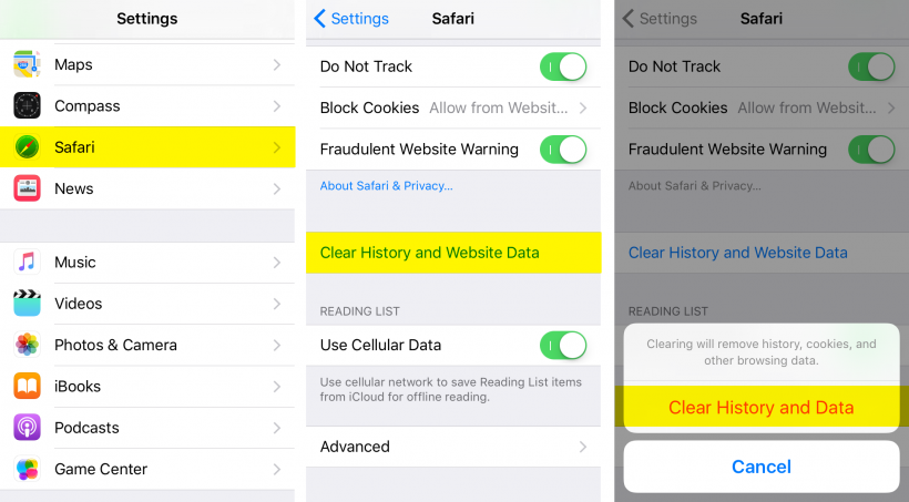 3. Scroll down again and tap Clear History and Website Data4. Confirm by selecting Clear History and Data