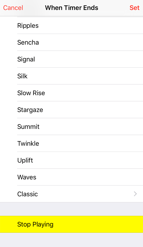 4. Below all of the normal ringtone selections, you will see an option for “Stop Playing.” Choose this and at the end of the chosen time period, whatever sound you are playing will automatically stop playing.
