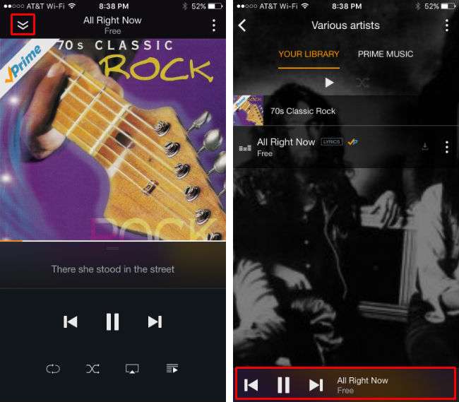 You can minimize this window with the down arrow icon in the top left, which will drop the play controls down to the bottom of the screen and allow you to continue browsing. The three dot menu icon in the top right will let you download the music if you haven't already, add it to a playlist or see more songs on the album and by the artist.