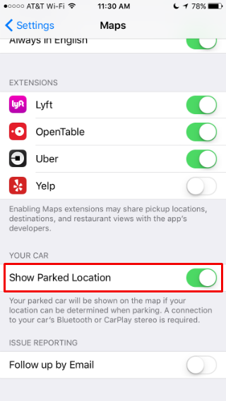 - Head to Settings -> Maps and scroll down to "Show Parked Location." Toggle it on. Once it is on, Maps will automatically mark the location of your car when you park it and turn the car off.