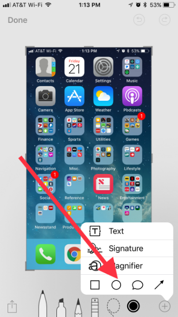 Now when you take a screenshot you will see a thumbnail appear in the bottom left corner for a few seconds. If you take multiple screenshots you will see them "stack." Tap on the thumbnail or stack of thumbnails to quickly edit and annotate them. A variety of Markup tools will appear at the bottom of the screen: