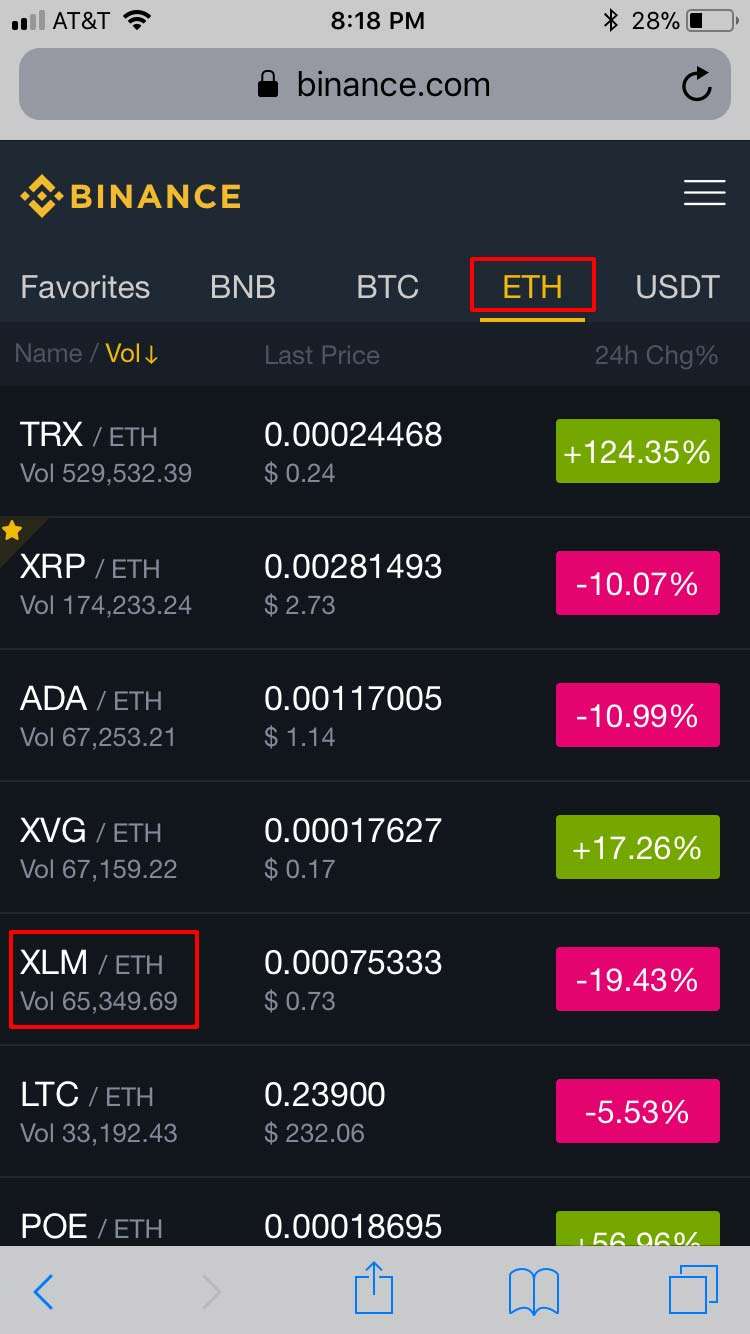 - Once your ETH is available in your Binance account, you can use it to buy XLM. Choose Markets from the mobile menu (stacked bar icon at the top right). Binance will show you a long list of markets.