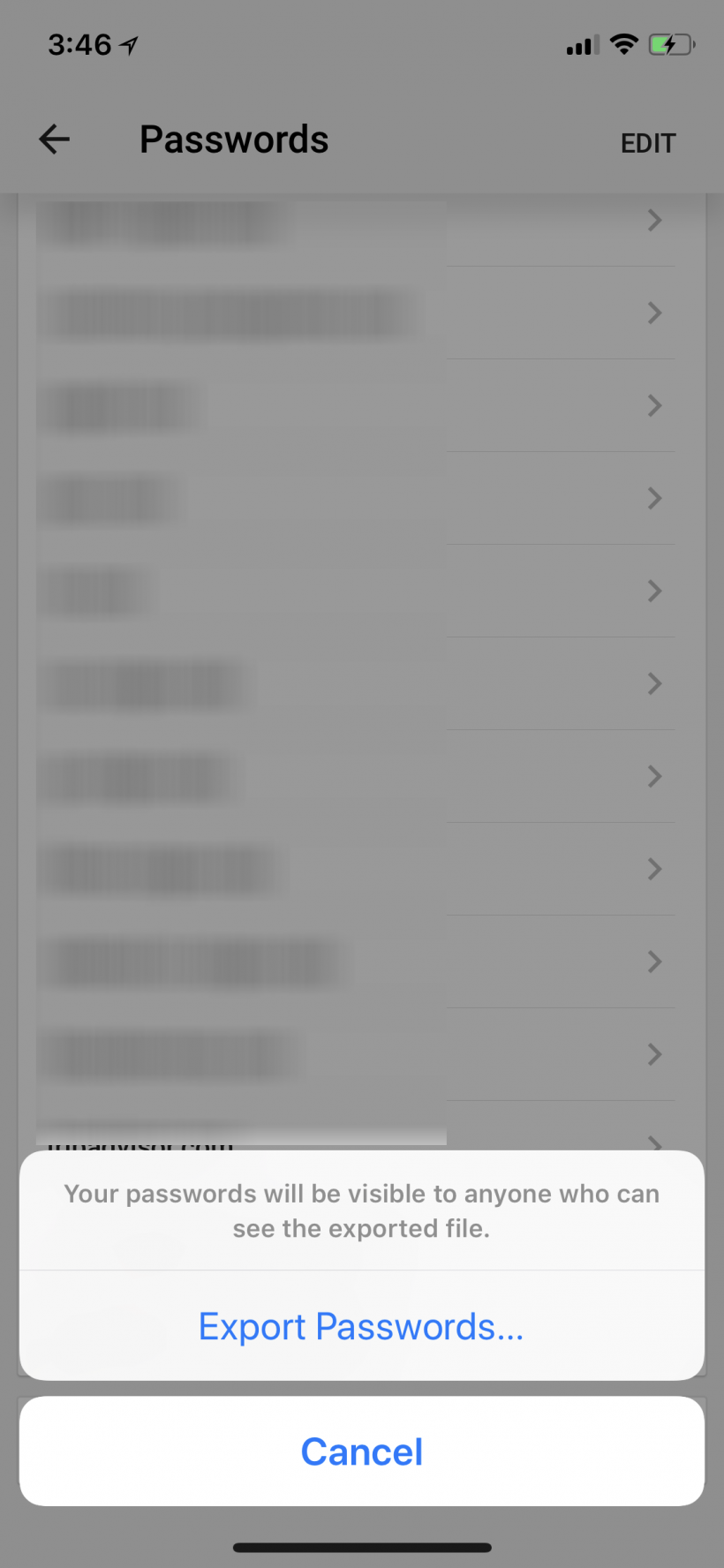 - You will be prompted to confirm, with a warning that anybody who sees the exported file will be able to see all of your passwords. Tap Export Passwords to confirm. You will then have to authorize with Touch ID or Face ID.