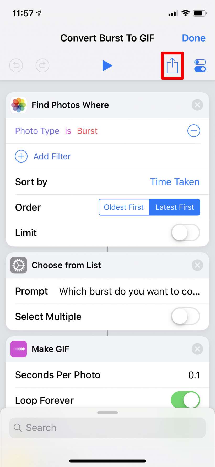 If you want to share your shortcut with others (or any of the pre-made shortcuts), simply open the Shortcuts app and tap on the three dot button in the top right corner of any shortcut in your Library.