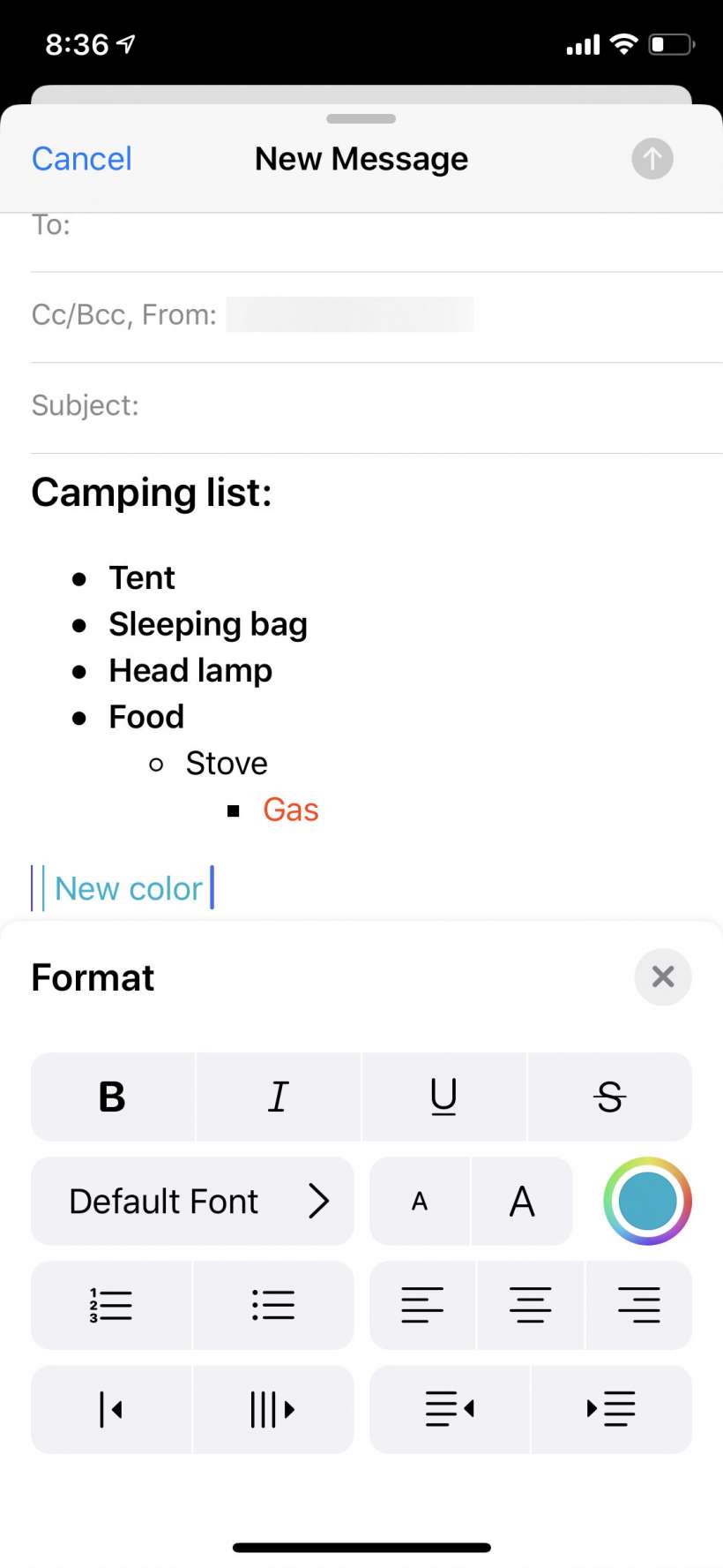 Until now you could only do very simple formatting of your email text - you could make it bold, italicized or underlined. iOS 13 adds rich text formatting, giving you many more options add style to your message with. Now you can quickly change font and text size and color, add numbered/bulleted lists and justify the text.