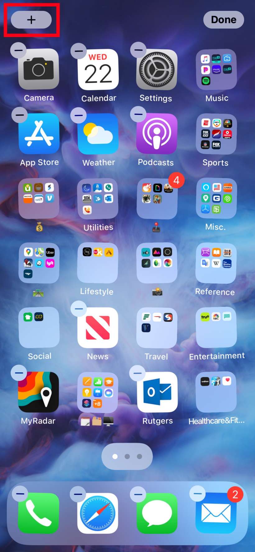 - First you'll want to add all of the widgets that you want in your customized stack to your Home Screen (or you can do them one or two at a time). You can do this by long pressing on a blank area of your Home Screen until the apps/folders start to wobble, then tap the "+" in the top left corner.