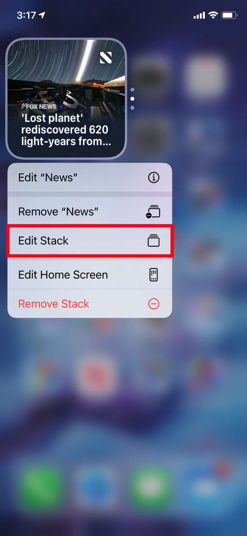 - If you want to remove a widget or change the order, long press on the stack until a menu comes up, then tap Edit Stack.
