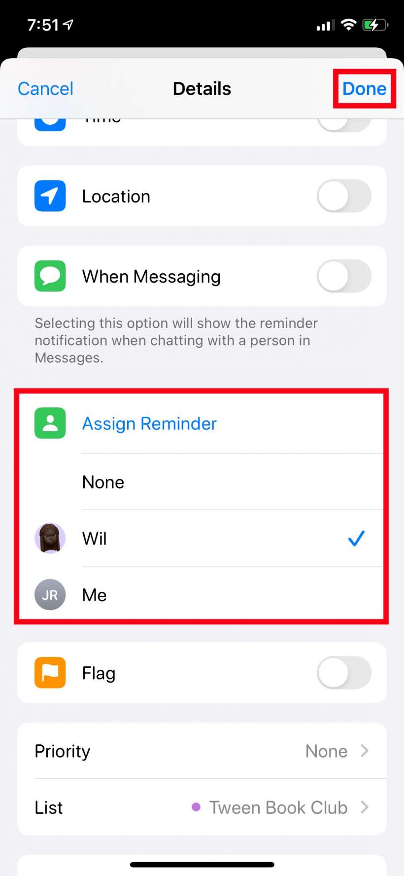 - Scroll down until you see Assign Reminder. Tap on it and a list of all the people the reminder has been shared with will appear. Tap on the person you want to assign it to, then tap Done in the top right.