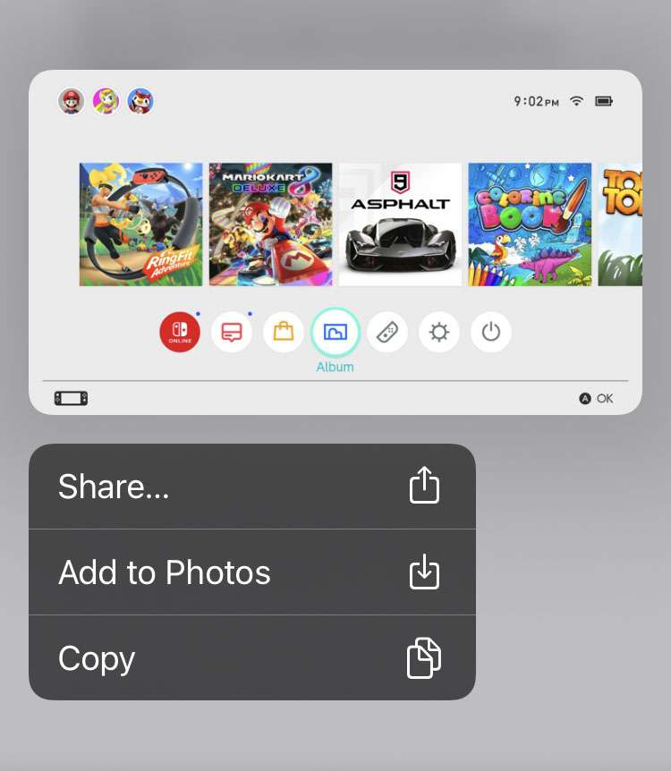 Nintendo Switch fans looking to share their favorite gaming moments can easily transfer screenshots right to their smartphone. All it takes to snap a screenshot or record a video on the Nintendo Switch is to tap or long press the square button on the left Joy-Con. These photos are collected in the Album and stored in memory on the device. Getting them to the iPhone means they can be posted or shared using any app.