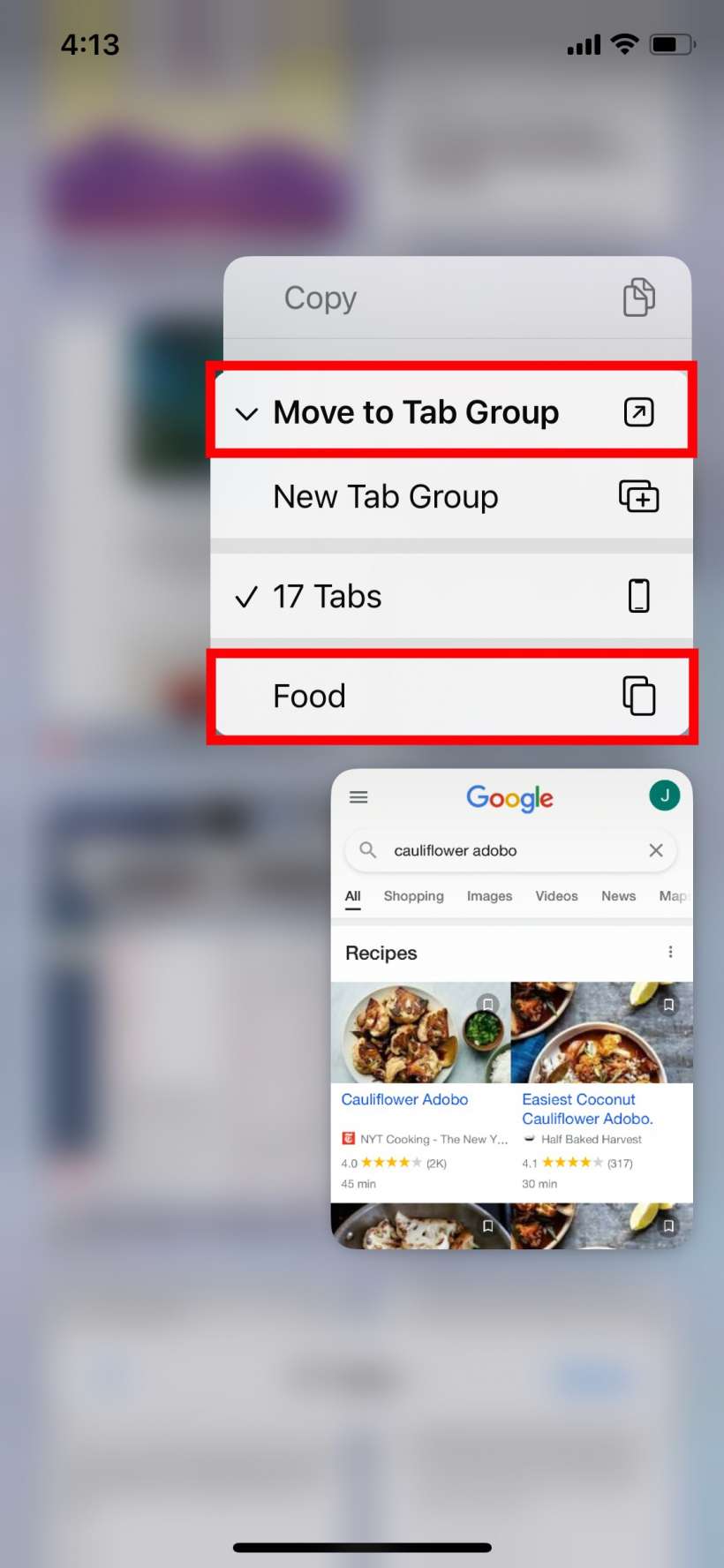 - Find a tab that belongs in your new group and long press on it until a menu appears. Tap Move to Tab Group which will open some dropdown options, select the name of the tab group you want to put it in.